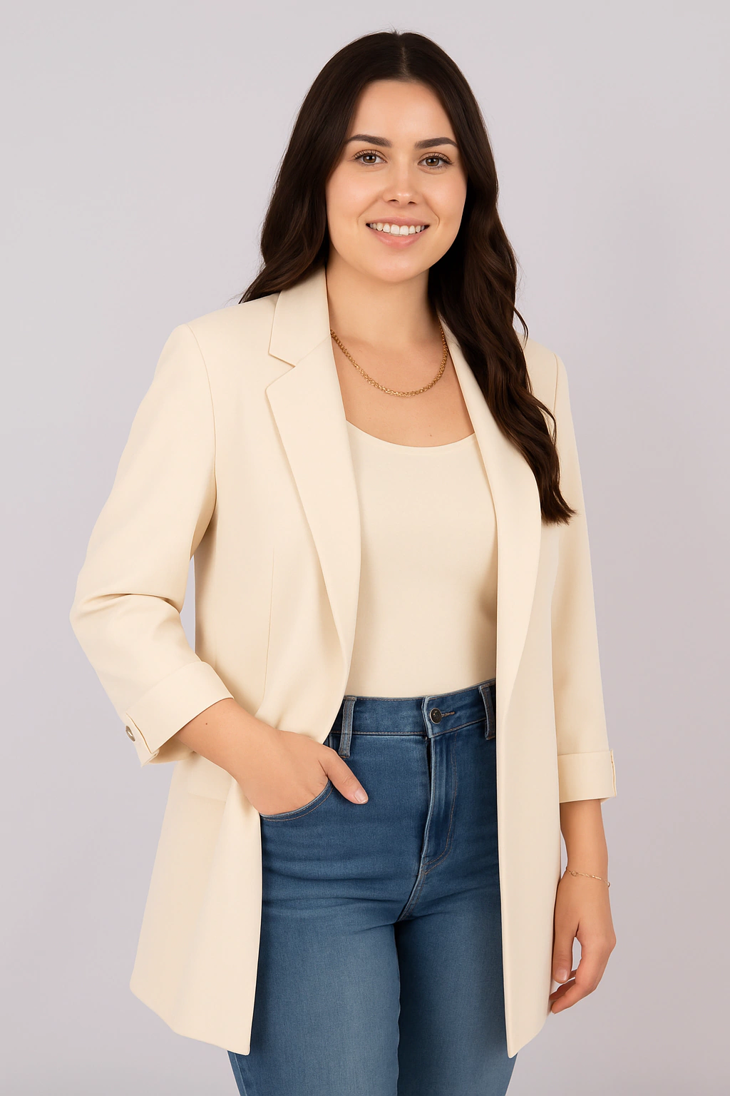 Nuestro BLAZER SASTRERO es la prenda ideal para sumar elegancia sin esfuerzo. Con un diseño estructurado y atemporal, cuenta con mangas 3/4 , forrería interna en razo y hombreras que realzan la silueta. Su solapa se mantiene perfectamente armada gracias a la entretela interna, aportando un calce prolijo y profesional. En lugar de botones frontales, optamos por un estilo más minimalista, mientras que los botones metálicos plateados en las mangas le dan un toque moderno y sofisticado. Además, incorpora simil bolsillos con tapa, que suman detalle sin romper la línea del diseño.