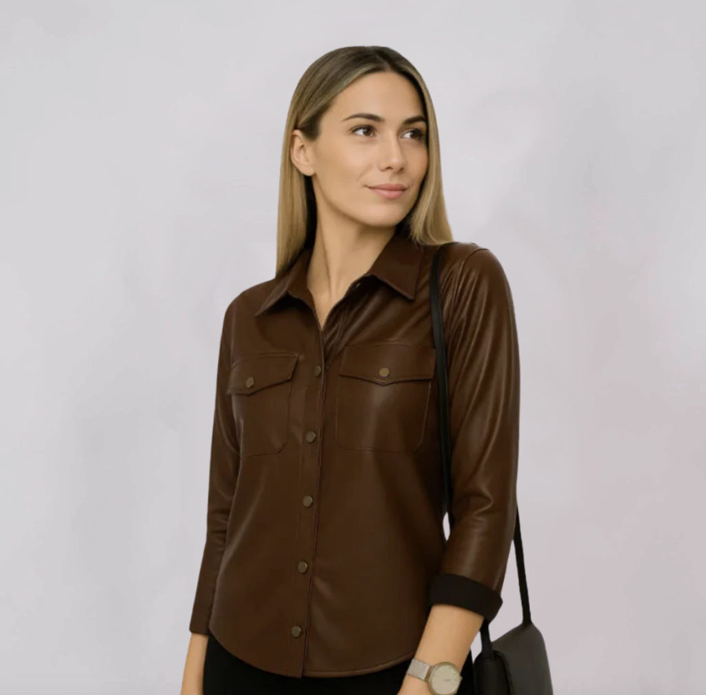 Nuestro CAMISACO DE ECO CUERO esta confeccionado con eco cuero, cuenta con botones a presión a lo largo de la misma y en los puños de sus mangas y 2 bolsillos con botones a la altura del pecho. Es la típica camisa manga larga engomada que necesitas para salir canchera de tu casa!